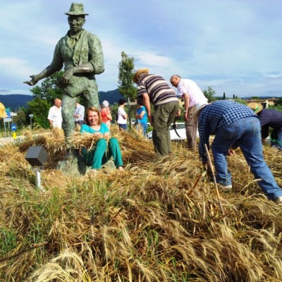 Vestiti come i contadini di qualche decennio fa e muniti degli attrezzi dell’epoca, compresa la falce messoria, lo mietono e poi, raccolto in fascine, lo collocano ai piedi della statua.