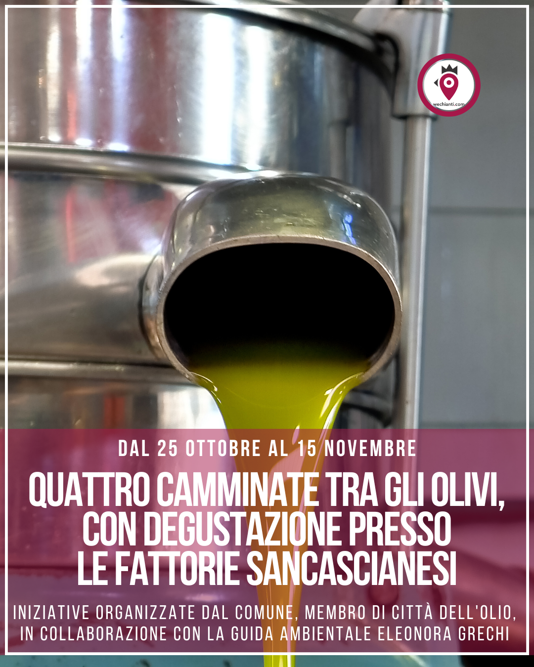 Il quartetto di escursioni, che richiede un abbigliamento comodo e scarpe da trekking, prende il via sabato 25 ottobre con un itinerario che toccherà il Frantoio Talente e le aziende Torriano e La Bruscola.