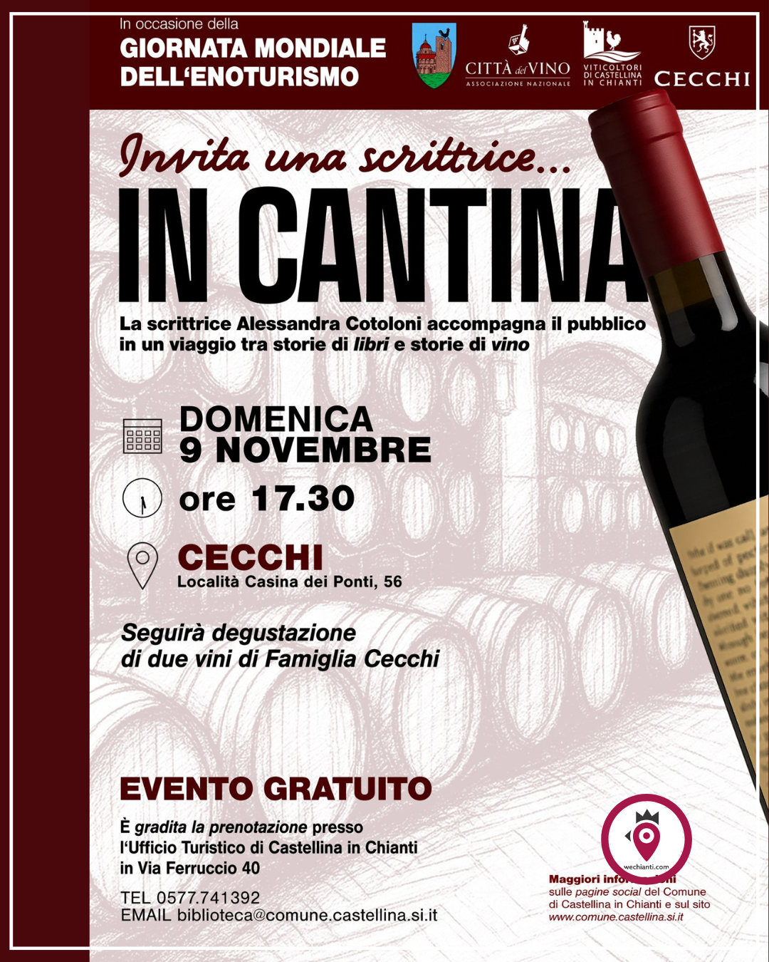 Alle ore 17.30, nella Cantina Cecchi (località Casina dei Ponti 56), la scrittrice Alessandra Cotoloni accompagnerà gli ospiti in un viaggio tra libri, storie e vino, un percorso pensato per raccontare il legame tra cultura, territorio e tradizione vitivinicola.