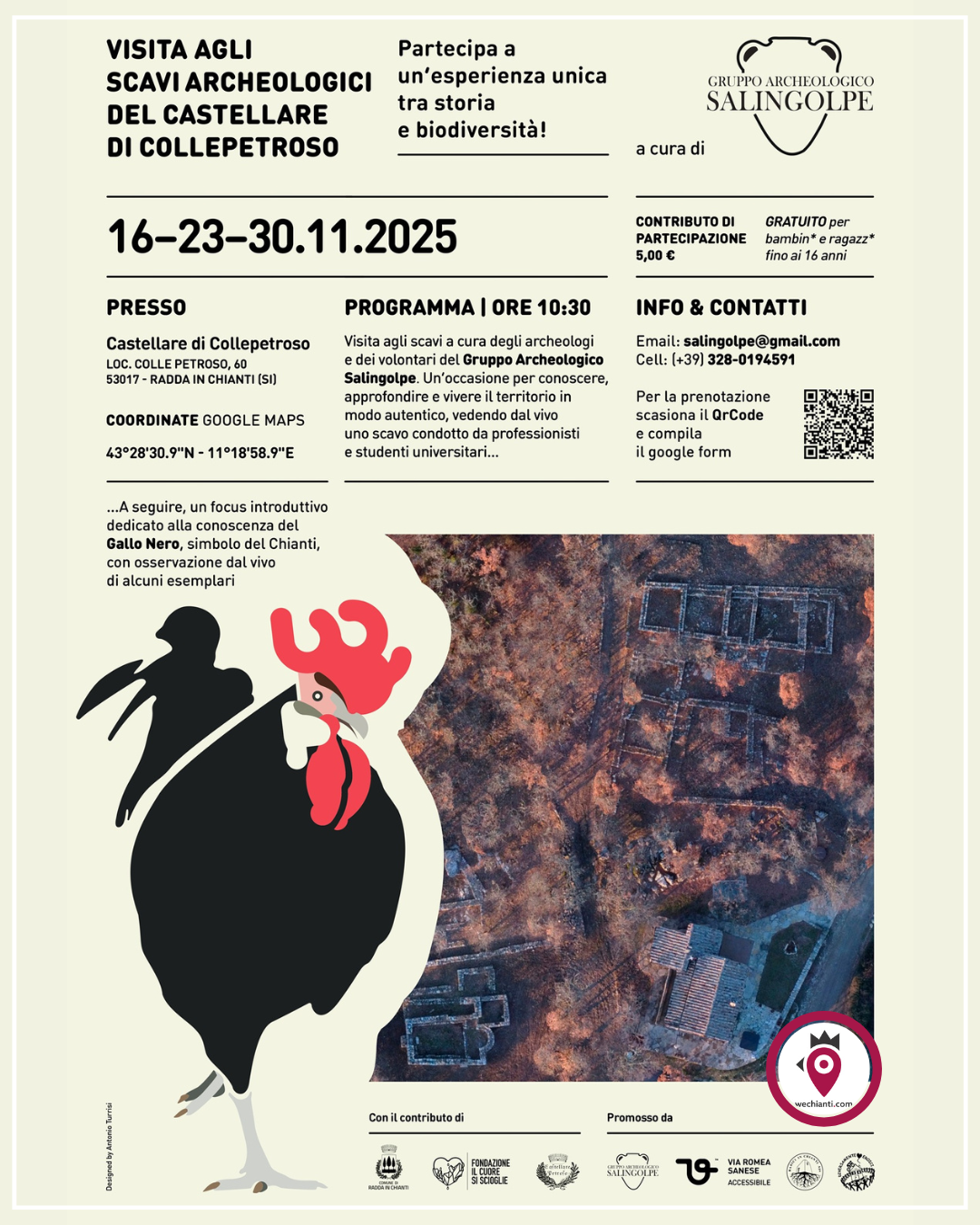 Nei giorni 16, 23 e 30 novembre, alle ore 10.30, si terranno le visite guidate agli scavi archeologici del Castellare di Collepetroso, nel comune di Radda in Chianti, promosse dal Gruppo Archeologico Salingolpe con la collaborazione degli archeologi incaricati, dei volontari e degli studenti universitari impegnati nelle attività di ricerca sul campo.