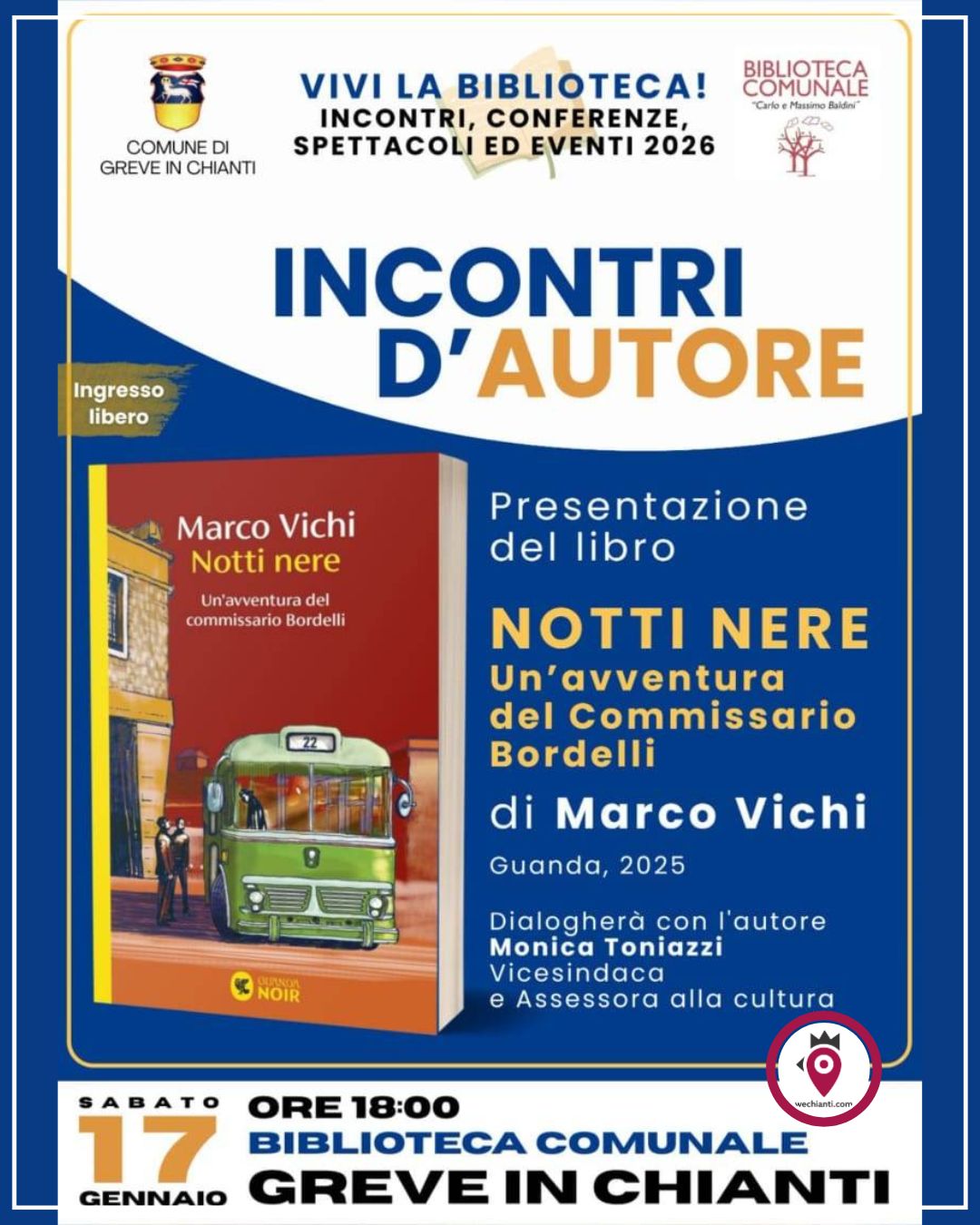 Con la prima presentazione del 2026: a Greve in Chianti arriverà lo scrittore imprunetino Marco Vichi, per parlare del suo ultimo romanzo, “Notti Nere”, negli spazi della biblioteca comunale di Greve in Chianti e risponderà alle domande dei suoi lettori.