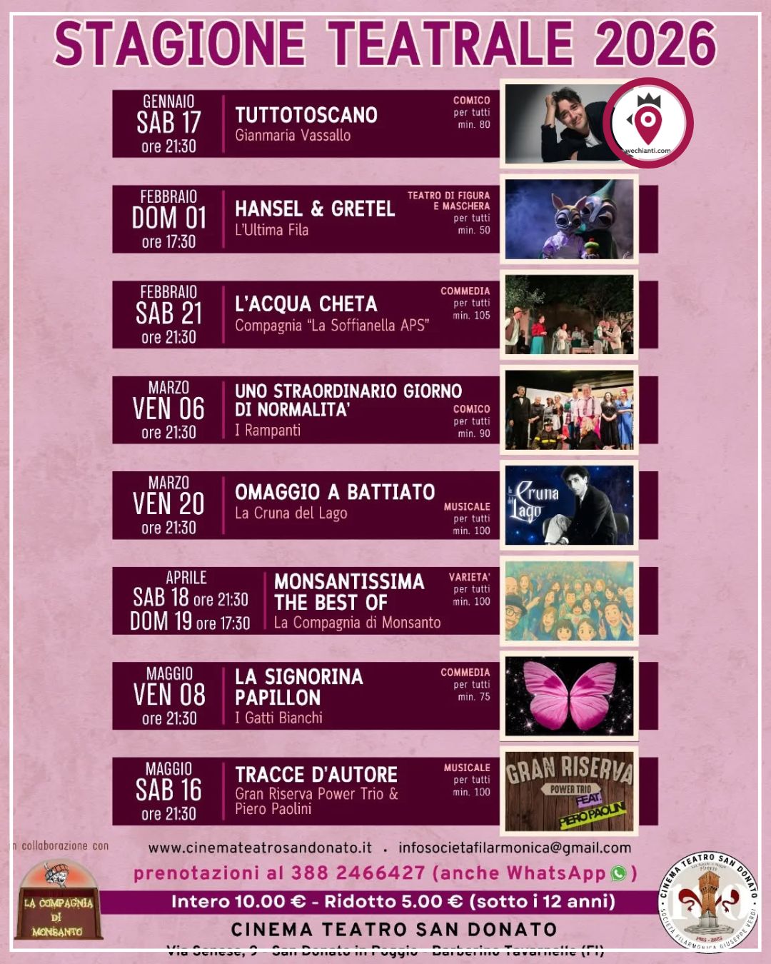 Il cartellone, che propone otto appuntamenti fino alla metà di maggio, vanta il patrocinio del Comune di Barberino Tavarnelle ed è stato confezionato in collaborazione con la Compagnia di Monsanto.