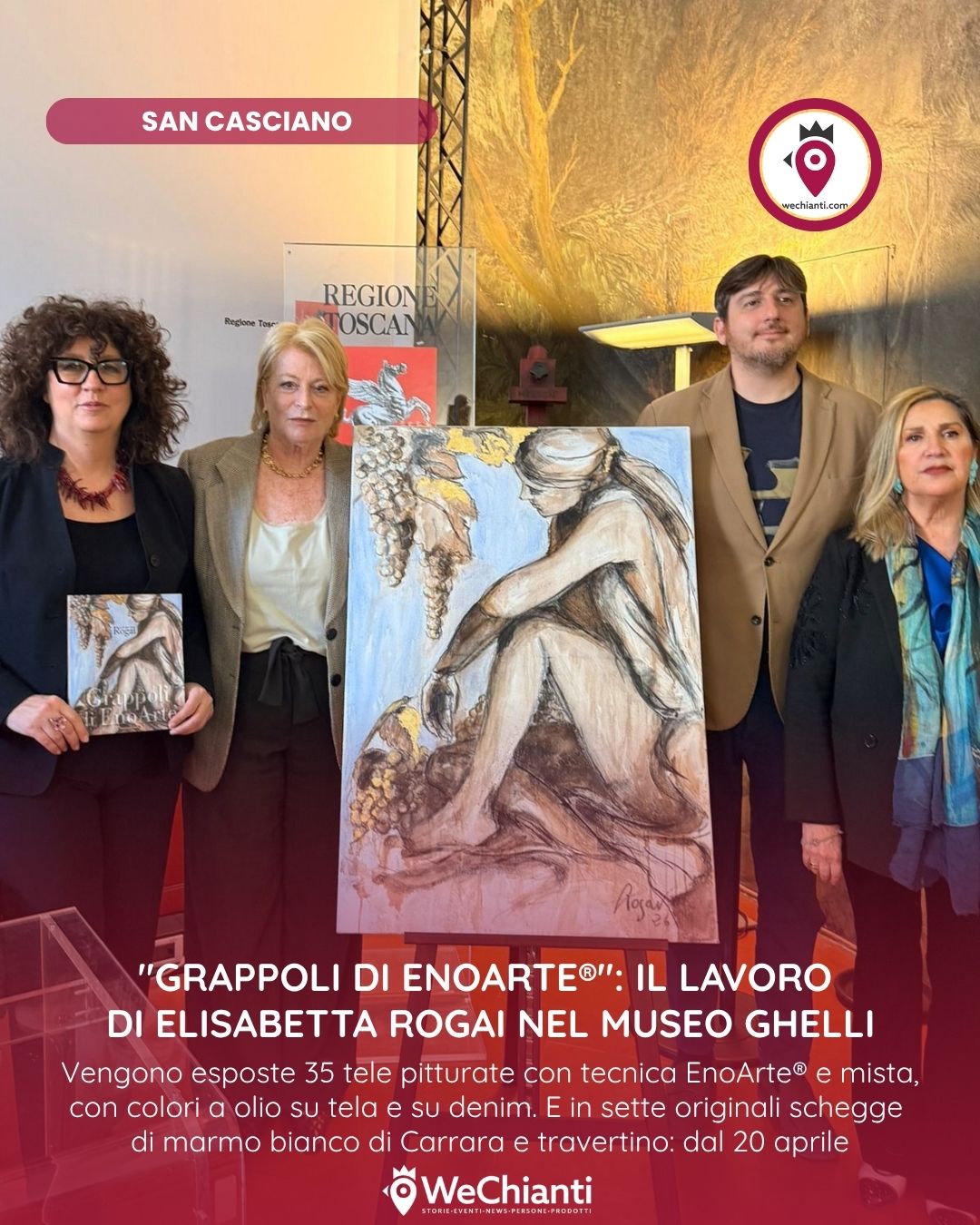 “Elisabetta Rogai – interviene l’assessora regionale alla cultura Cristina Manetti – ha un percorso artistico molto interessante, soprattutto nell’evoluzione dell’enoarte. Attraverso la pittura del vino, in un territorio dedicato come quello di San Casciano, con questa mostra si realizza una chiusura del cerchio perfetta. Per questo ringrazio il sindaco Roberto Ciappi, che dà voce e spazio a una grande artista figlia della Toscana. Invito tutti ad andare a vedere le opere di Elisabetta Rogai, anche per scoprire il bel luogo che la ospita, dedicato al Maestro Ghelli, proprio nel centro di San Casciano”.